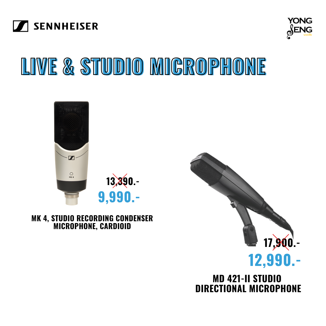 ไมโครโฟนสำหรับจ่อกลอง และเครื่อง Percussion Sennheiser e904 เป็นไมค์แบบไดนามิค, มีรูปแบบการรับเสียงแบบ Cardioid Pick Up Pattern, ตอบสนองความถี่ 40-18Hz, Impedence 350 Ohm, Fast Transient Response, Hum Compensation, Standard XLR Connector