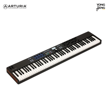 88-note USB MIDI Keyboard Controller, 9 Rotary Knobs, 8 Pads, 9 Faders, and Analog Lab Software - Mac/PC Specs : Type: Keyboard Controller Number of Keys: 88 Type of Keys: Semi-weighted Velocity Sensitive: Yes Pads: 8 x Back-lit Performance Pads Other Controllers: Pitchbend, Mod Wheel Encoders/Pots: 9 x Rotary Knobs, 1 x Clickable Jog Wheel Faders: 9 x Faders Dedicated Transport Control: Mackie/HUI Compatible Pedal Inputs: 1 x 1/4" (sustain) MIDI I/O: Out/USB USB: 1 x Type B Computer Connectivity: USB Features: Chord Play Mode Software: Analog Lab, Ableton Live Lite, UVI Grand Piano Model D Format: Standalone, AAX, AU, VST (iLok account required) Hardware Requirements - Mac: 2GHz Processor or higher, 4GB RAM minimum Hardware Requirements - PC: 2GHz Processor or higher, 4GB RAM minimum OS Requirements - Mac: OS X 10.10 or later OS Requirements - PC: Windows 7 SP1 or later Power Supply: USB Bus powered / 9V DC positive center power supply (sold separately) Height: 2.48" Width: 49.59" Depth: 10.26" Weight: 18.7 lbs.
