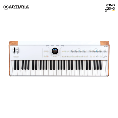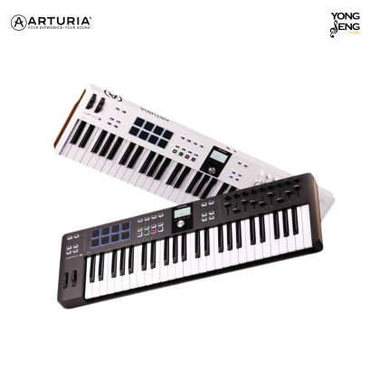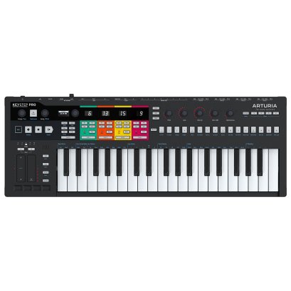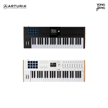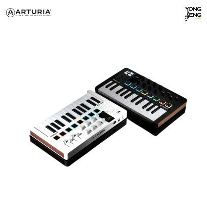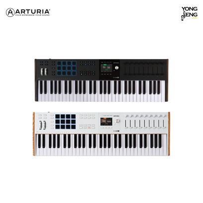 Premium Keybed quality 61-note velocity-sensitive keyboard with hybrid synth-piano feel Pads & controls 1 clickable encoder 9 rotary encoders 9 x 30mm faders 6 transport switches 4 command switches 1 modulation wheel & bend wheel 8 touch & pressure-sensitive pads Display control 2.5” LCD display with contextual buttons Real-time feedback on tweaks and controls Smart features Multi-mode arpeggiator Chord mode Scale mode Hold function Semitone transpose Software integration Seamless integration with all Arturia software instruments, including Analog Lab Intro: select sounds, browse presets, smart-assigned controls Custom DAW scripts for FL Studio, Logic Pro, Ableton Live, Cubase, Bitwig Studio Also compatible with MCU/HUI control Up to 5 user presets for a totally customizable experience Included Software titles & services Analog Lab V software with 2000+ sounds Ableton Live Lite Native Instruments’ The Gentleman UVI Model D 2-month Loopcloud subscription Melodics subscription Connectivity USB-C connects to computers and MIDI Control Center MIDI 5-pin DIN output for connection to external instruments, gear Control input for pedal: sustain, expression, or footswitch USB-C powered