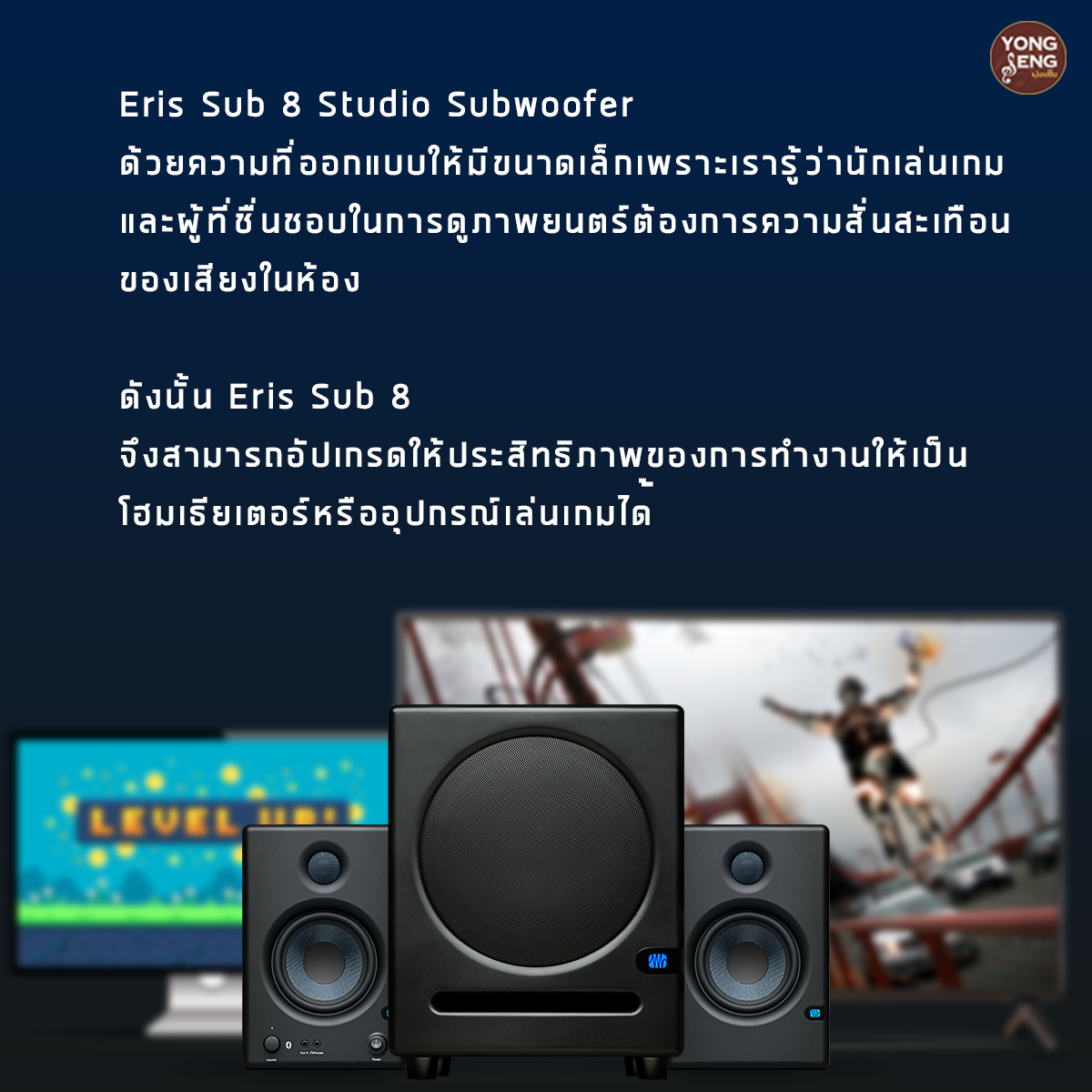 Eris Sub 8 Studio Subwoofer ด้วยความที่ออกแบบให้มีขนาดเล็กเพราะเรารู้ว่านักเล่นเกมและผู้ที่ชื่นชอบในการดูภาพยนตร์ต้องการความสั่นสะเทือนของเสียงในห้อง ดังนั้น Eris Sub 8 จึงสามารถอัปเกรดให้ประสิทธิภาพของการทำงานให้เป็นโฮมเธียเตอร์หรืออุปกรณ์เล่น
