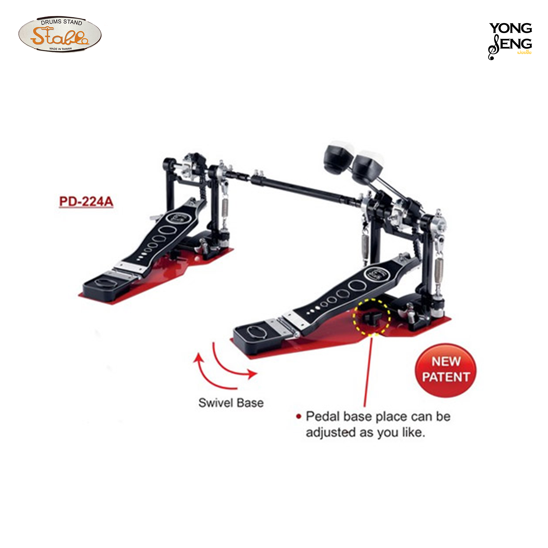 STABLE กระเดื่องคู่ ปรับซ้าย-ขวาได้ รุ่น PD-224A รุ่นฐานแดง เป็นการออกแบบที่ตอบสนองความต้องการของนักดนตรีได้ดี มีตัวปรับความตึงของสปริง แผ่นเหยียบแบบเหล็ก บานพับเป็นอะลูมิเนียมอย่างดี มีตัวปรับด้านข้างสามารถปรับตำแหน่งฐานคันเหยียบได้ตามต้องการ